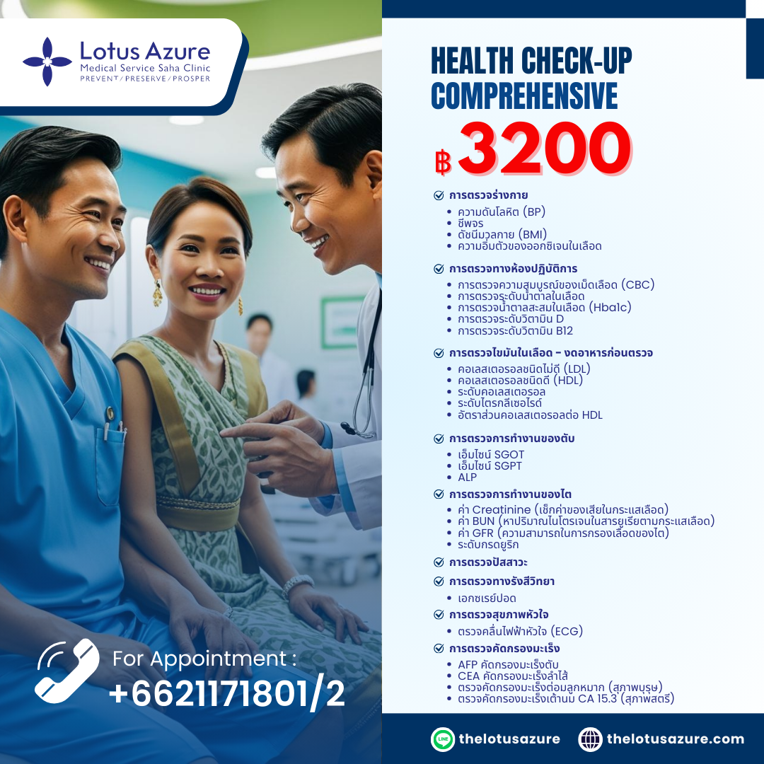 November 23, 2025 No Comments Health Check-up Comprehensive “Hormone Check-up Package Female” has been added to your cart. View cart ฿3,200.00 Physical examination Laboratory tests Lipid profile(fasting needed) Liver Function tests Renal/Kidney function tests Urine Analysis BP Pulse BMI Saturation CBC Glucose (fasting/random) Hba1c Vit D Vit B12 LDL HDL Cholesterol Triglycerides Cholesterol/HDL ratio SGOT SGPT ALP AFP CEA PSA for males CA 15.3 for females Creatinine BUN GFR Uric acid Radiology Cardiac Evaluation Cancer Markers Chest Xray ECG Talk to Expert Health Check-up Comprehensive quantity Add to Cart Category: Packages Description Description Health Check-up Comprehensive Related products Hormones Check-up Normal (Male) ฿2,695.00 Add to cart Talk to Expert Hormones Check-up Normal (Female) ฿2,920.00 Add to cart Talk to Expert Hormones Check-up Advanced ฿8,705.00 Add to cart Talk to Expert Health Check-up Advanced ฿1,350.00 Add to cart Talk to Expert