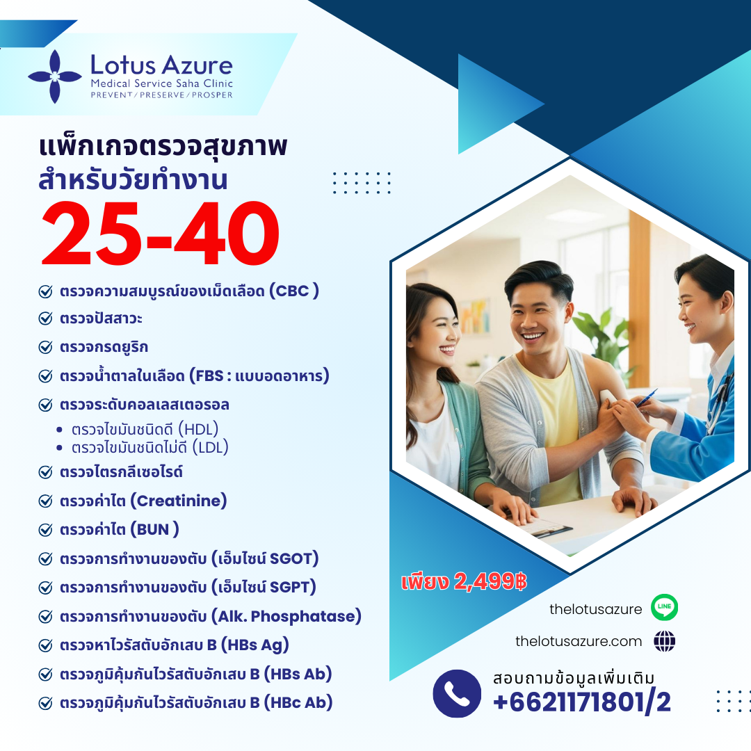 November 23, 2025 No Comments Young Employee Health Check-up 25-40 ฿2,499.00 CBC Urine Analysis Uric Acid test FBS Total Cholesterol Triglyceride Creatinine HDL LDL BUN SGOT SGPT Alk. Phosphatase HBs Ag HBs Ab HBc Ab Talk to Expert Young Employee Health Check-up 25-40 quantity Add to Cart Category: Packages Description Description Young Employee Health Check-up 25-40 Related products Hormones Check-up Advanced ฿8,705.00 Add to cart Talk to Expert Special Package For MEN over 40 ฿4,499.00 Add to cart Talk to Expert Hormone Check-up Package Female ฿6,430.00 Add to cart Talk to Expert Basic Health Check Package ฿950.00 Add to cart Talk to Expert